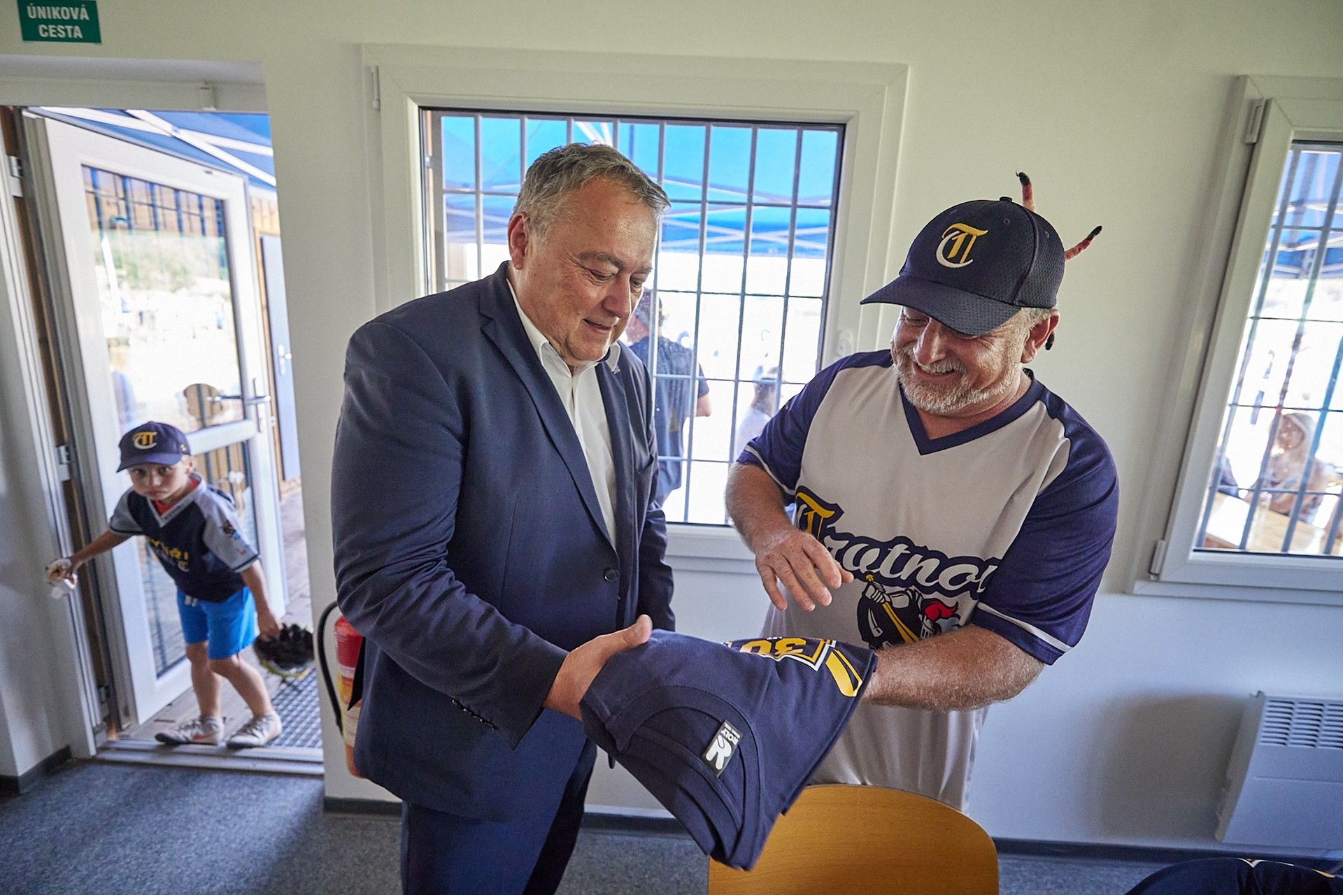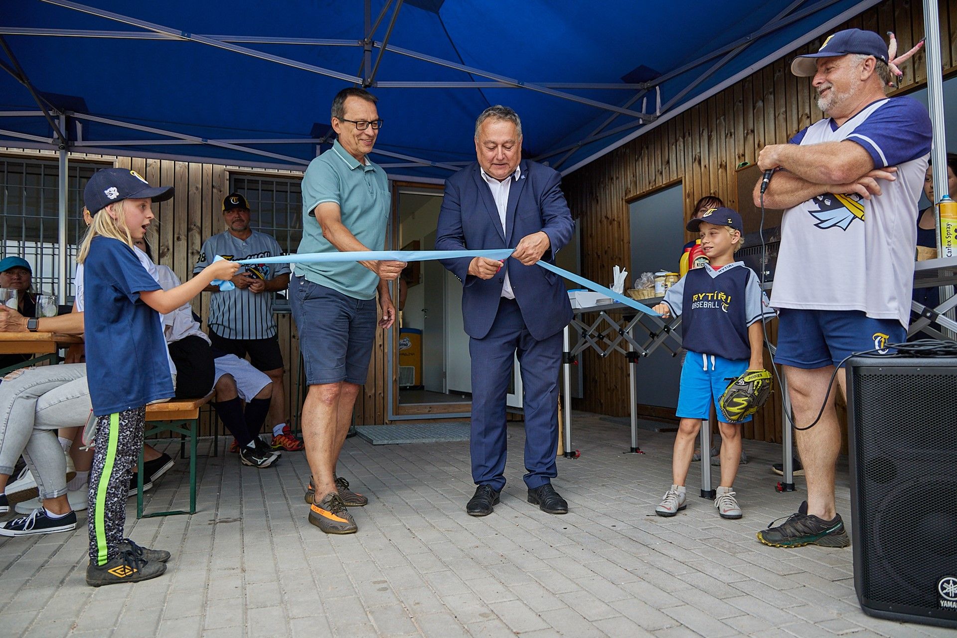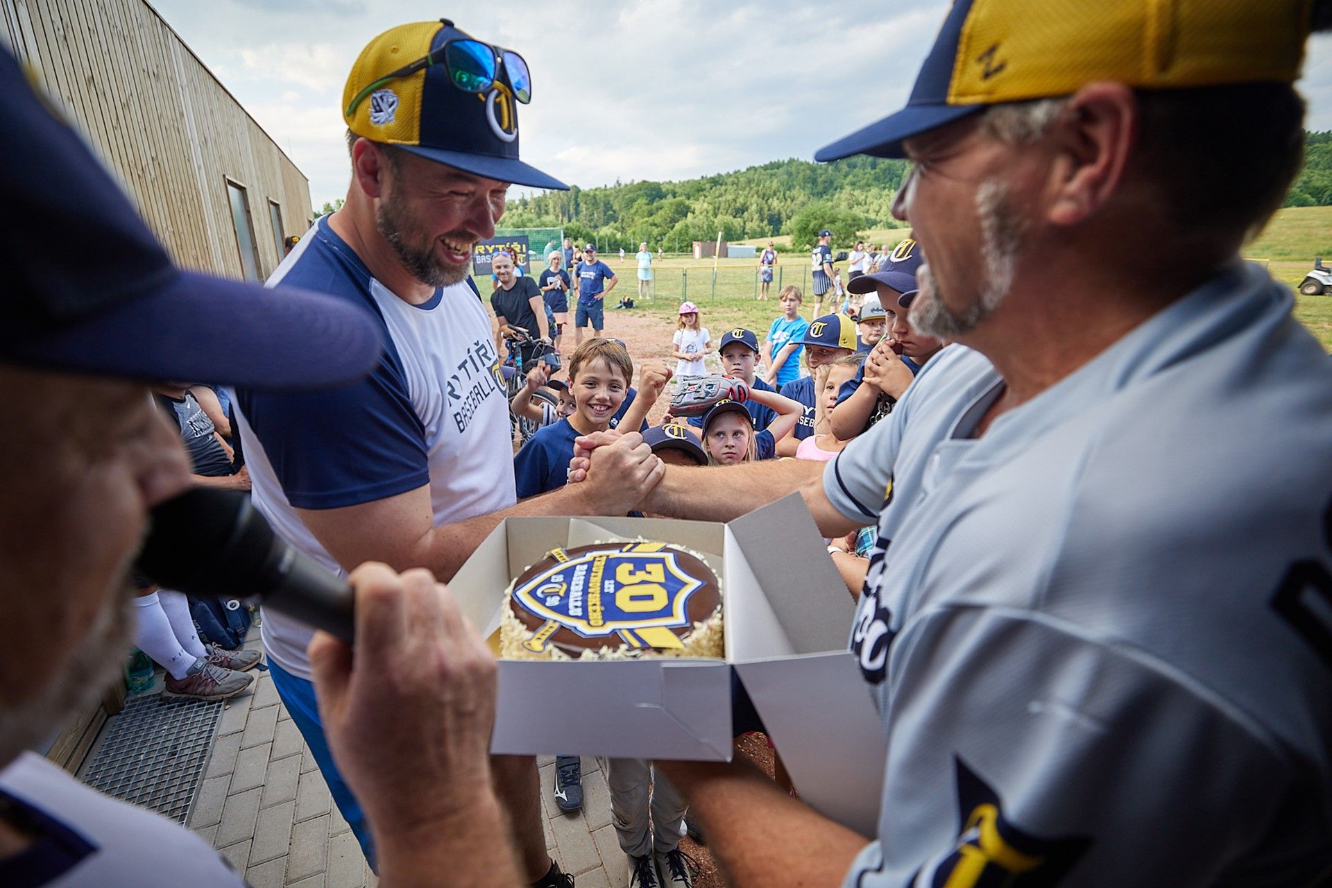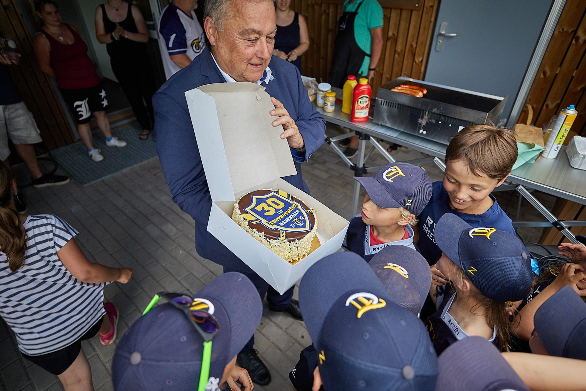 Baseballisté se při pondělním otevření nového zázemí na pálkařském hřišti rozhodli vydražit mezi sebou dort vyrobený speciálně k jejich jubileu. Nejvyšší nabídka činila 10 tisíc korun. Peníze míří na jižní Moravu zasaženou ničivým tornádem. Do dortu řízli jako první nejmenší členové klubu